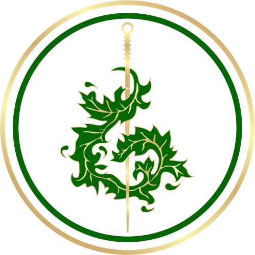O símbolo do CNAA une a agulha de acupuntura à folha da artemísia — planta sagrada da MTC — sobre um círculo de ouro que representa excelência, unidade e reconhecimento profissional.
